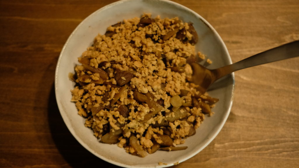 鶏ひき肉とごぼうの炒め物。ご飯のお供